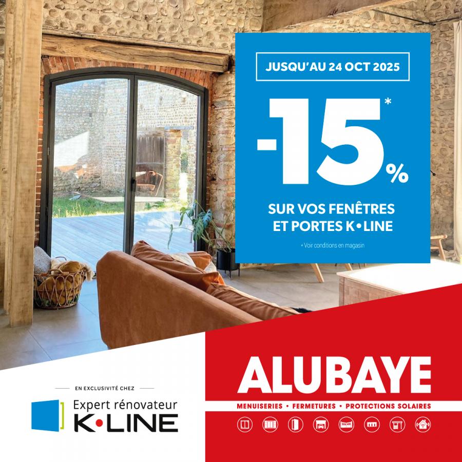 Profitez de nos offres exceptionnelles sur les menuiseries aluminium K-Line du 22 septembre au 24 octobre 2025 chez Alubaye. Les journées raccourcissent, les températures baissent… Il est temps de penser à l’isolation de votre maison ! Optez pour les menuiseries K-Line et bénéficiez des avantages suivants :